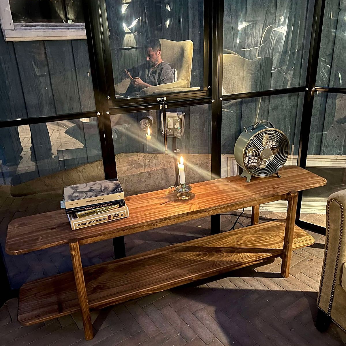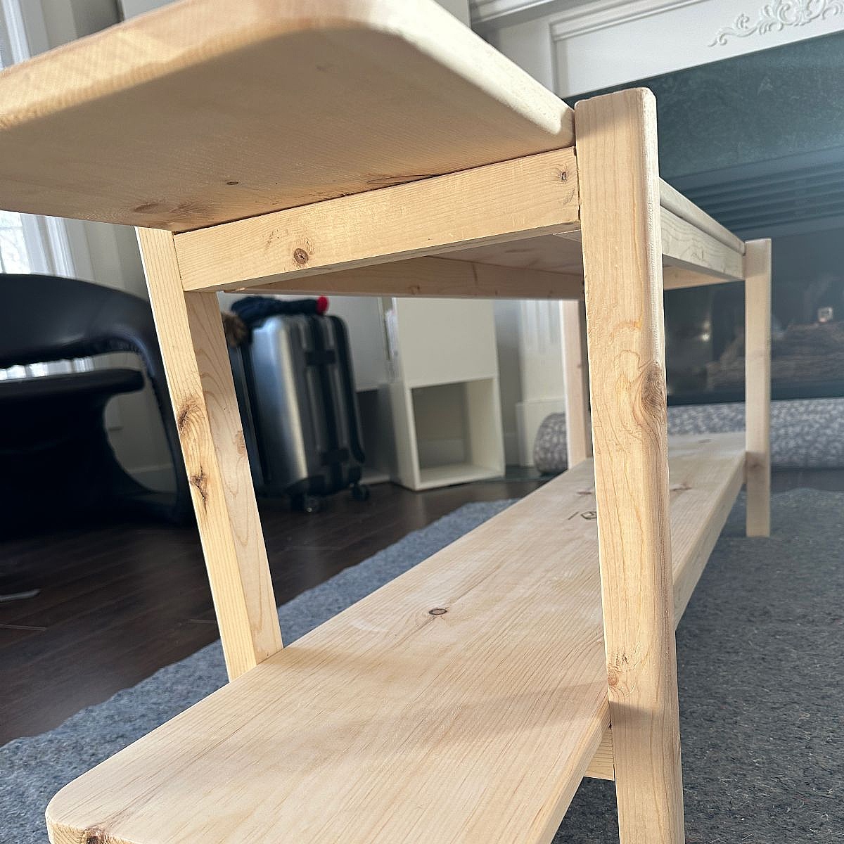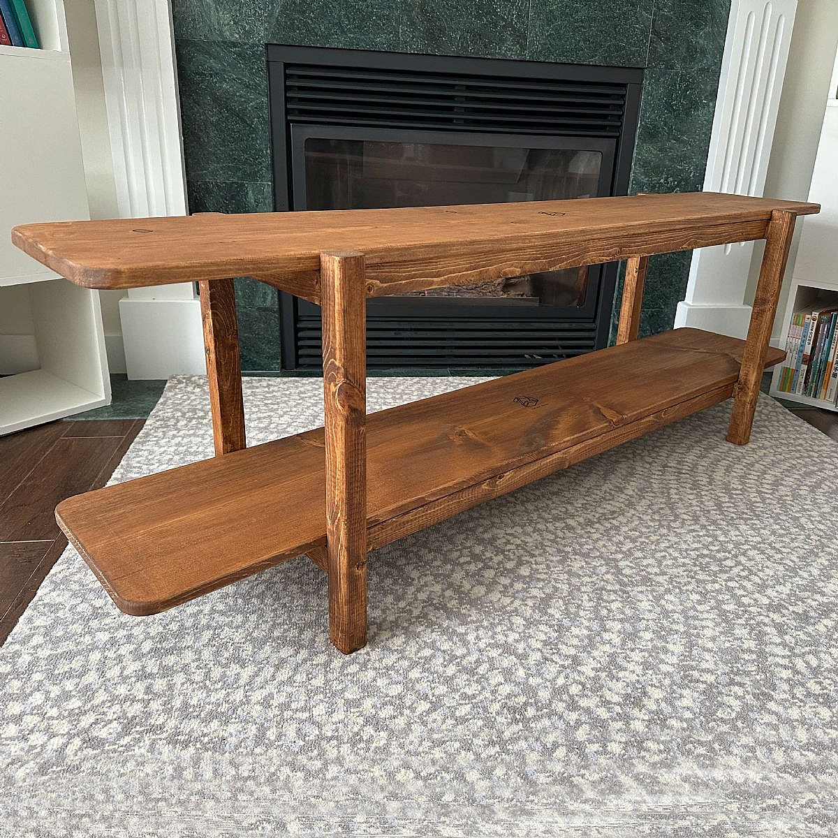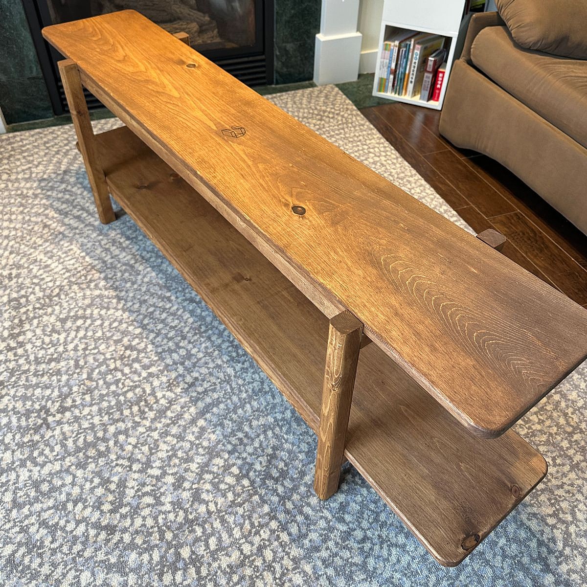 This double-layer shelf was custom-designed to maximize functionality and aesthetic appeal. Crafted from natural pine wood, it measures 60” L x 11” W x 20” H. Built with care using traditional mortise-and-tenon joinery, the shelf is entirely free of screws and nails, ensuring durability and a clean, seamless look. Completed on November 17, 2024, it features a beautiful finish in Special Walnut Stain, highlighting the natural grain of the wood while adding a touch of warmth and elegance.