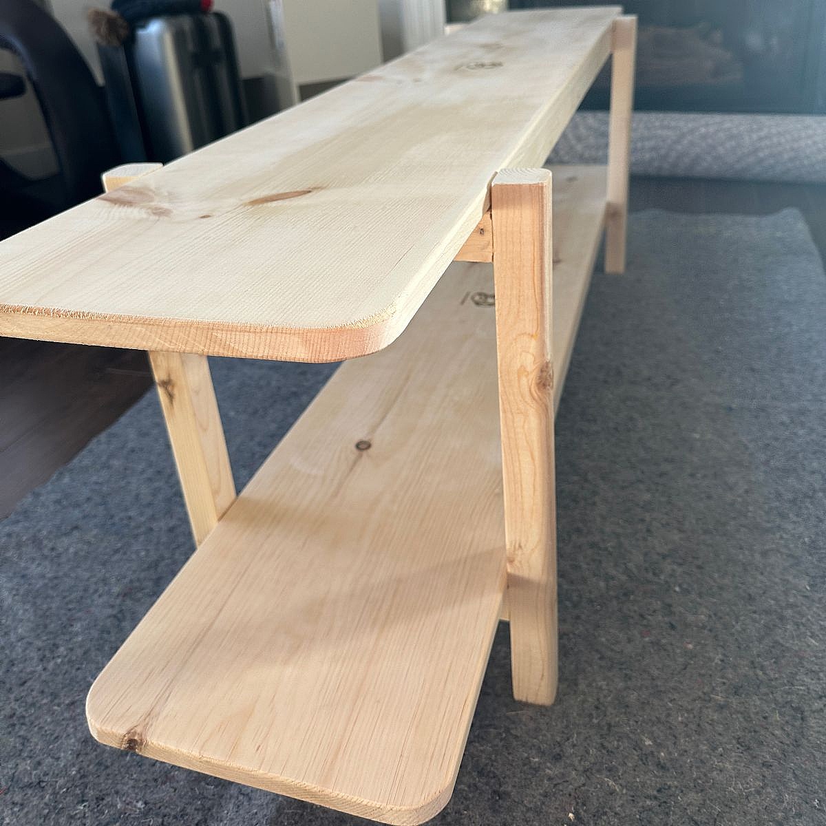 This double-layer shelf was custom-designed to maximize functionality and aesthetic appeal. Crafted from natural pine wood, it measures 60” L x 11” W x 20” H. Built with care using traditional mortise-and-tenon joinery, the shelf is entirely free of screws and nails, ensuring durability and a clean, seamless look. Completed on November 17, 2024, it features a beautiful finish in Special Walnut Stain, highlighting the natural grain of the wood while adding a touch of warmth and elegance.