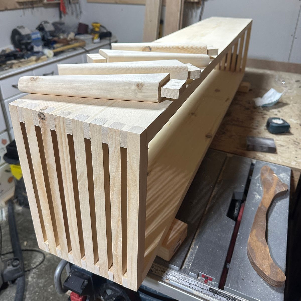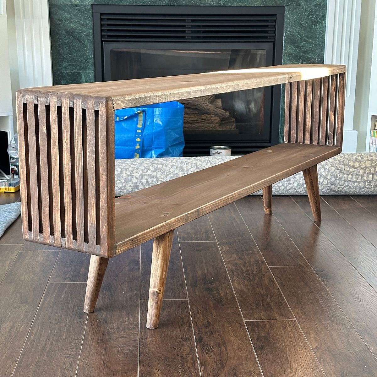 This bookshelf was custom-designed for a client’s new business opening, serving as both a bookshelf and a stand for a fireplace. Made from durable 5/4-inch x 10-inch x 8 ft. Knotty Pine Board, the piece measures 60” W x 13” + 9” H x 11” D and was completed in 5 days.